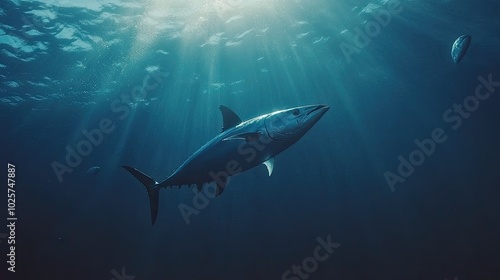 Fototapeta premium A fast-moving tuna fish swimming through the deep ocean, surrounded by other...