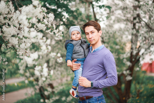 © Aleksei Zakharov, Fototapeta premium A father and a little boy are having fun near the cherry blossom trees.