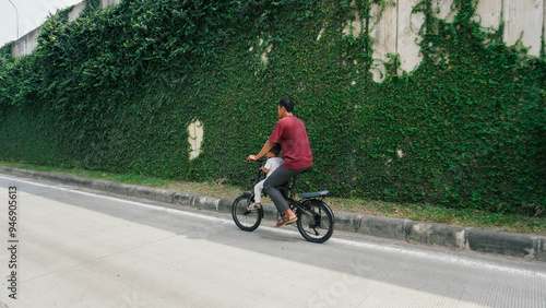 © indraprakkk, Obraz premium A father and son riding a bicycle on a quiet road, flanked by a tall green ivy wall. A serene urban scene capturing familial joy