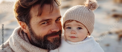© Hryhor Denys, Obraz premium A father holds his smiling child close on a beach at sunset, both dressed warmly in winter attire, sharing a joyful moment together