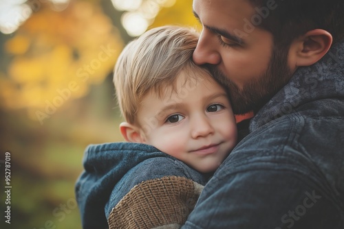 Obraz premium A father lovingly holds his child in a warm embrace, standing outdoors during...