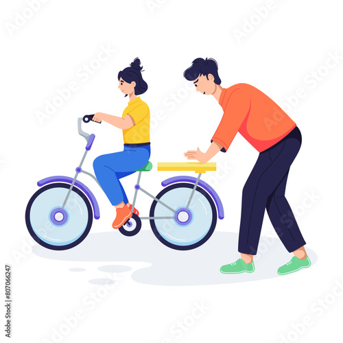 Fototapeta premium A father teaching cycling to kid, flat illustration