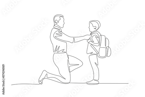 Obraz premium A father who straightens his child's clothes before leaving for school. School kids concept one-line drawing