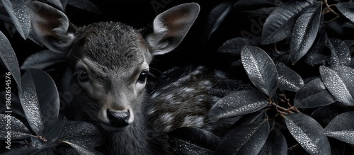 © Rahayu, Fototapeta premium A Fawn Hiding Among Dark Leaves.