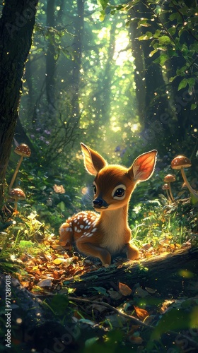 © Maria Starus, Fototapeta premium A fawn sitting in the middle of a forest