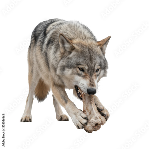 © Gustav, Fototapeta premium A fearsome grey wolf gnawing on a large bone against a stark black background