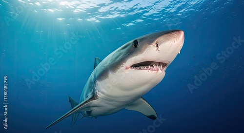 Naklejka premium A fearsome shark swims towards the viewer, its teeth bared, in a vibrant blue ocean. Sunlight streams from above, illuminating its form and the marine environment