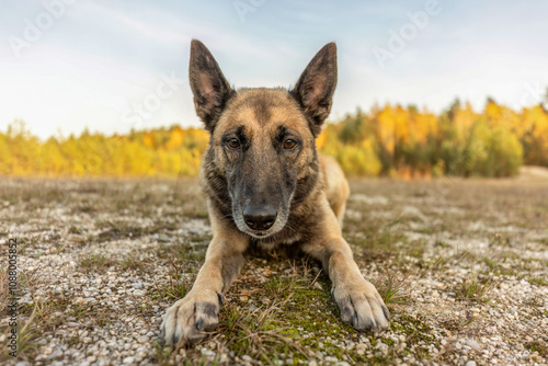 Fototapeta premium A female belgian malinois dog on a meadow in autumn outdoors