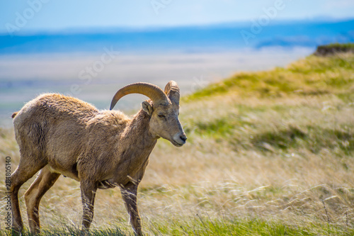 © CheriAlguire, Naklejka premium A female Bighorn Sheep in the field of Badlands National Park, South Dakota