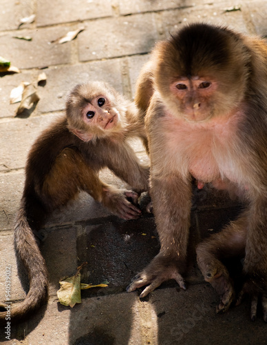 Fototapeta premium A female capuchin monkey and her baby monkey looking at camera