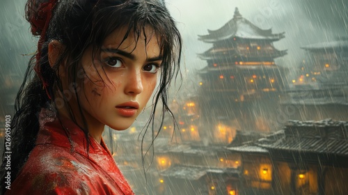 © aan, Obraz premium A female cyborg with glowing implants gazes at a futuristic city, neon lights illuminating the streets beneath a dark sky.
