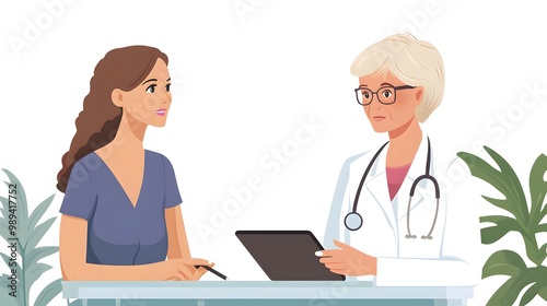 Fototapeta premium A female doctor in a white coat consulting with a patient in a medical setting.