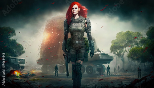 © anthony, Fototapeta premium A female fantasy warrior with long red hair,