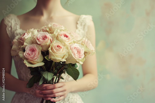 © pundapanda, Naklejka premium A female flower seller gracefully holds a bouquet of roses, the soft pastel background enhancing the delicate beauty and vibrant colors of the blooms, beautiful girl with roses in her hands