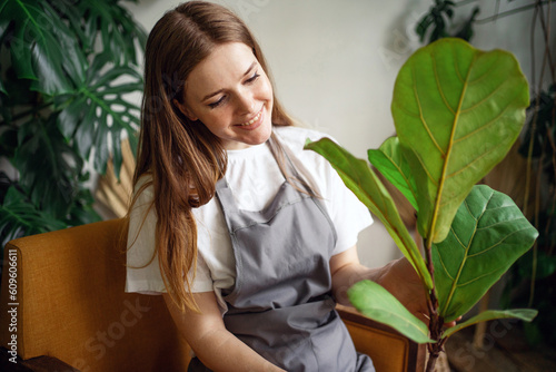 © muse studio, Obraz premium A female gardener takes care of plants, passionate about her hobby.