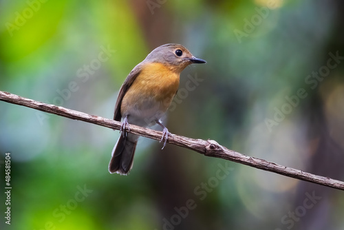 © ukk, Fototapeta premium A female hill blue flycatcher with dull brown color , greyish head , grey - brown wings.