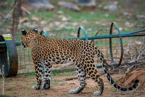 © Sourabh, Obraz premium A female leopard or panther or panthera pardus in green background at jhalana forest reserve, jaipur, rajasthan, india