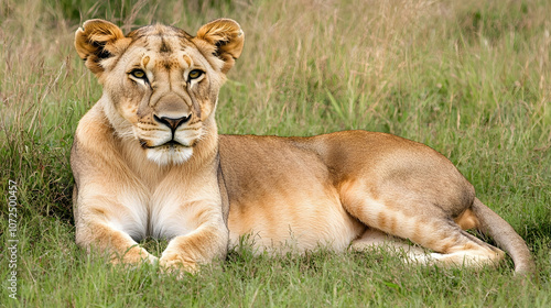 © visual artstock, Obraz premium A female lion rests in tall grass, looking directly at the camera with a regal expression.