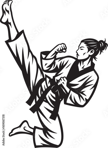 Fototapeta premium A female martial artist performing a high kick in a dynamic karate pose.