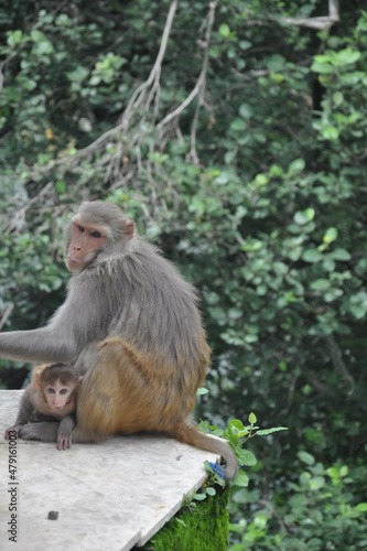 © Yaman247, Fototapeta premium A female monkey with her baby sitting outside in park