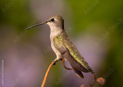 © Melani, Obraz premium A female or immature Black Chinned Hummingbird perches on a delicately curling grape tendril with out of focus green and purple plants in the background.
