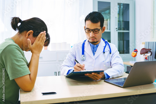 Fototapeta premium A female patient meets a male doctor at a desk in a hospital, discussing her migraine headache, stress, and insomnia. The doctor provides advice, diagnosis, and treatment options