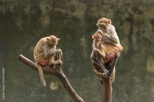 Fototapeta premium A female Rhesus macaque is picking up the lices from her baby hair while her son is sitting near by.