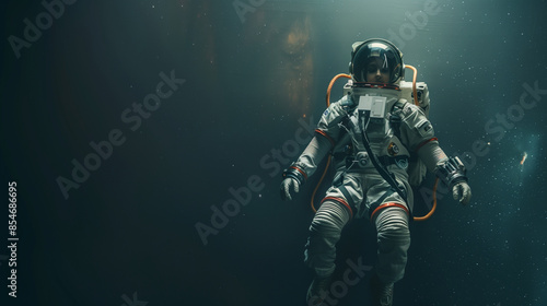 Fototapeta premium A female space explorer in an advanced space suit, floating in zero gravity , with copy space