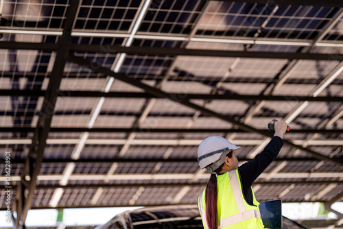 Fototapeta premium A female technician in a hard hat and reflective vest conducts a solar panel...