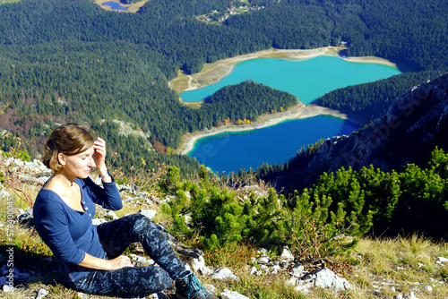 © tanyatorgonskaya, Naklejka premium A female tourist sits on the top of Medjed Mountain against the background of the beauty of the Montenegrin national park Durmitor - the picturesque Black Lake and coniferous forest