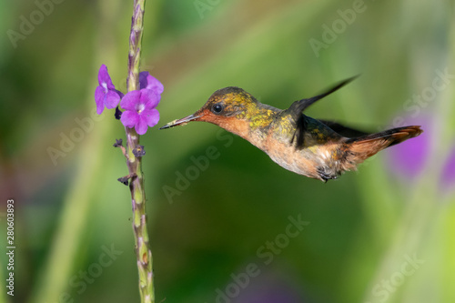 © Chelsea Sampson, Fototapeta premium A female Tufted Coquette feeds on Vervein flower in a garden.