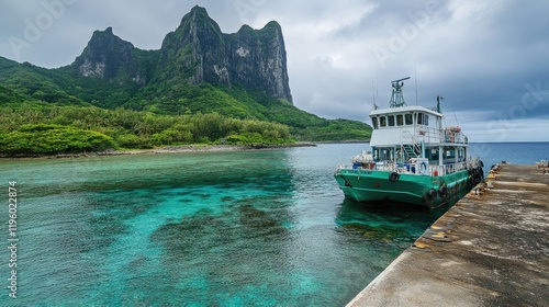 © Pannee, Fototapeta premium A ferry arriving at a scenic island port surrounded by clear sea.