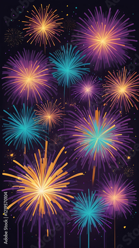 © Facundo, Naklejka premium A festive and vibrant background featuring fireworks explosions in radiant shades of purple, gold, and turquoise against a dark sky.