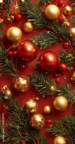 Fototapeta premium A festive arrangement of Christmas ornaments and greenery on a red background.