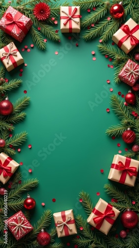 Fototapeta premium A festive arrangement of gifts and ornaments surrounded by evergreen branches on a vibrant green background during the holiday season