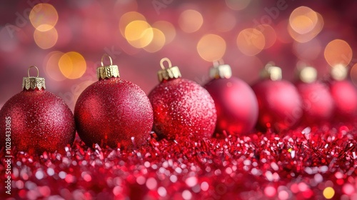 Fototapeta premium A festive arrangement of glittery red Christmas ornaments lined up on shimmering tinsel, with a soft bokeh background of holiday lights.