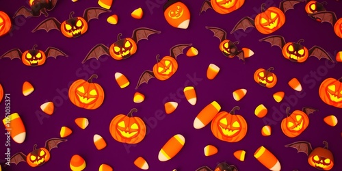 Fototapeta premium A Festive Arrangement of Illuminated Pumpkins and Bats with Candy Corn on a Deep Purple Background