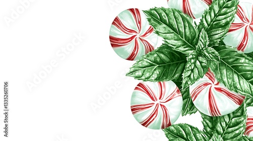 Naklejka premium A festive arrangement of peppermint candies and mint leaves on a white background.