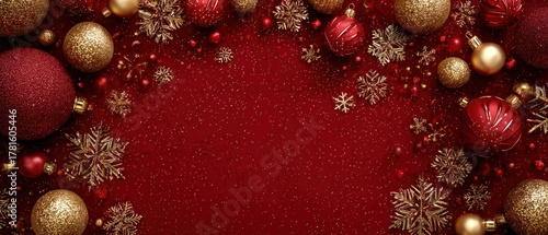 Obraz premium A festive arrangement of red and gold Christmas ornaments, sparkling snowflakes, and a glittery background, perfect for holiday celebrations.