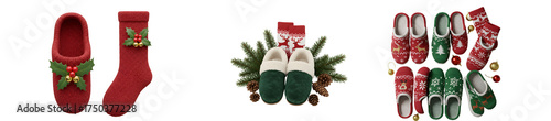 © Faizan, Fototapeta premium A festive array of christmas themed slippers and socks arranged in a decorative holiday display on transparent background