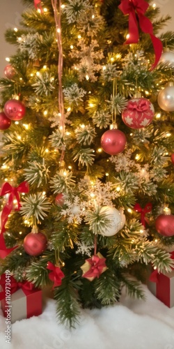 Fototapeta premium A festive Christmas background with a decorated tree, twinkling lights, and ornaments, yuletide, traditional