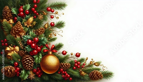 Fototapeta premium A festive Christmas border with pine branches, holly berries, and a golden ornament