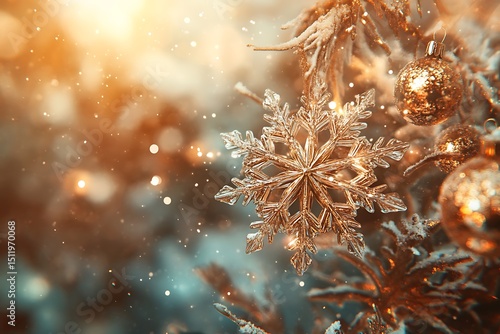 © PNG Studio, Obraz premium A festive Christmas decoration with glittery snowflakes and golden baubles.