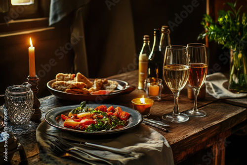 Naklejka premium A festive Christmas dinner table with wine, salad, seafood, cheese, and fresh vegetables, featuring red and white colors and a healthy, delicious spread for a cozy meal