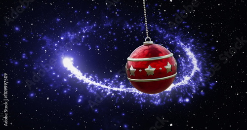 © vectorfusionart, Naklejka premium A festive Christmas ornament floats in space, surrounded by stars