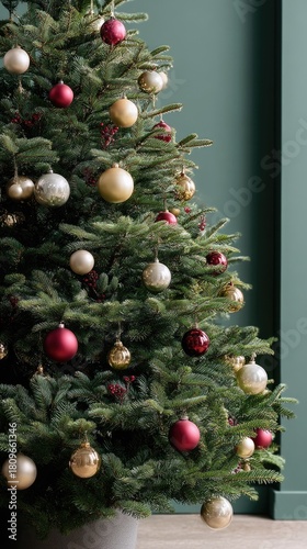 Fototapeta premium A festive Christmas tree adorned with golden decorations and small berries...