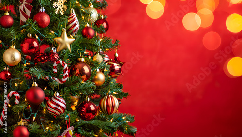 Fototapeta premium A festive christmas tree decorated with red and gold ornaments against a bokeh background