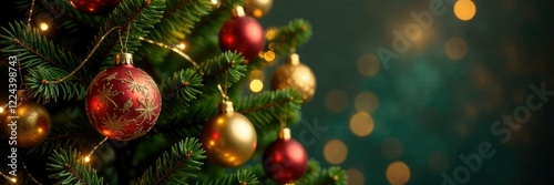 © Prasert, Obraz premium A festive Christmas tree with gold ornaments and lights, festive, twinkling