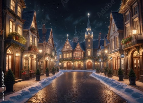 Fototapeta premium A festive Christmas village with glittering buildings and sparkling streets, christmas village, colorful decorations, festive architecture