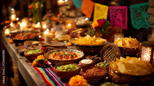 © Shannon, Fototapeta premium A festive Cinco De Mayo party set up with traditional Mexican food spread (2)